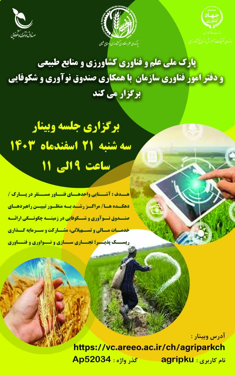برگزاری جلسه وبینار پارک ملی علم و فناوری کشاورزی و منابع طبیعی و دفتر امور فناوری با همکاری صندوق نوآوری و شکوفایی برگزار می کند .